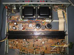 Left, circuitry of the STA-85 shows the large heat-sink and typical 1977 year 30 watt per channel layout with two separate boards, but not the better chassis-stiffened simple circuitry boards of the STA-78. Smoothing-cans are inferior to the STA-78 as of snap-in circuit mount type but overall sound may be almost as good based on listening tests. A ribbon wire is seen on the input and British Meridian and Arcam Alpha style chokes in the output stage, instead of the more usual and sometimes preferred, 'air core coils'. The output resistors are metal film and would be improved with ceramic wire-wound, but today such vintage components, once cheaply available, may be unobtainable. STA-85 are rare and might otherwise make a good enthusiast project. The transformer appears to be from Hitachi Metals.